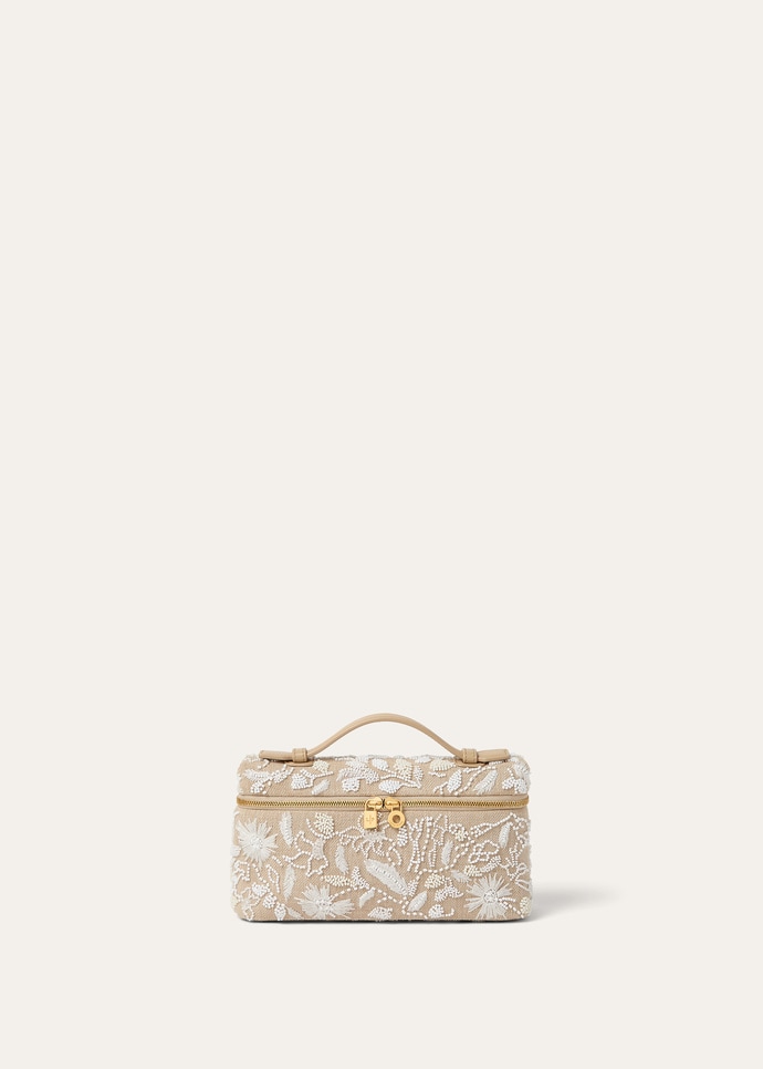 Versatile and endlessly refined, the Extra Pocket L19 is a quintessential Loro Piana pouch with timeless charm. It is crafted from Summer Linen crepe with sophisticated, light-catching bead embroidery. The petite accessory can be carried crossbody or in hand, with the chain and jewel strap removed.